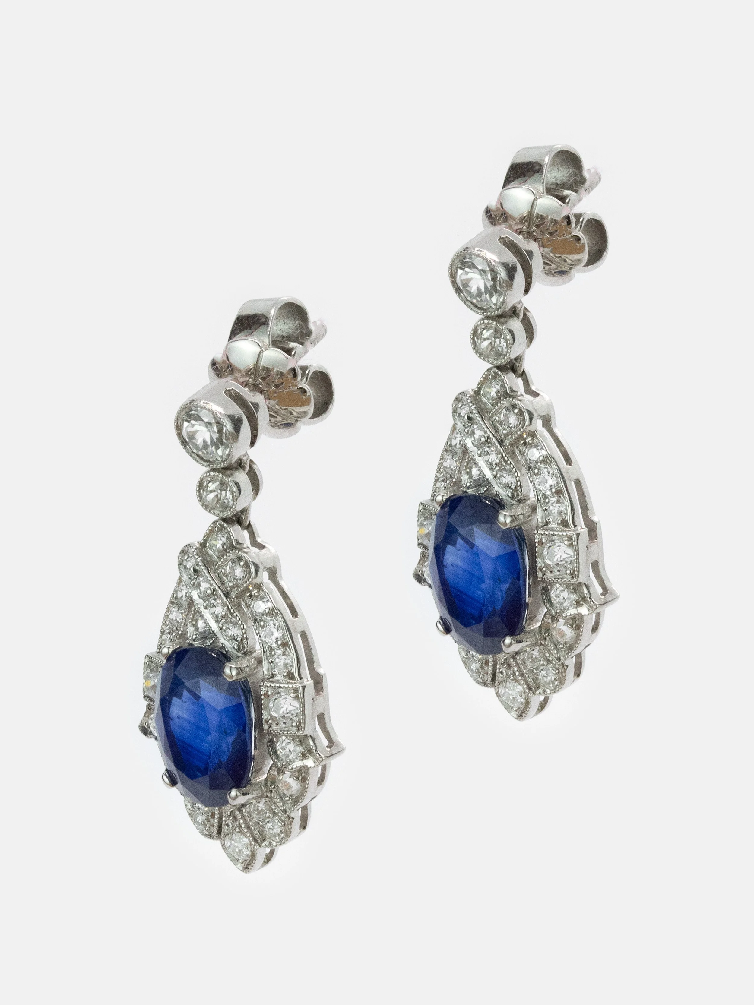 A pair of yellow gold micromosaic earrings, crafted in the form of stylised evil eyes. Each earring is composed of vivid blue mosaic tiles, centred around a round-cut sapphire, its rich hue echoing the surrounding enamel tones. One earring is finished with an articulated sapphire drop, adding subtle movement and light play.