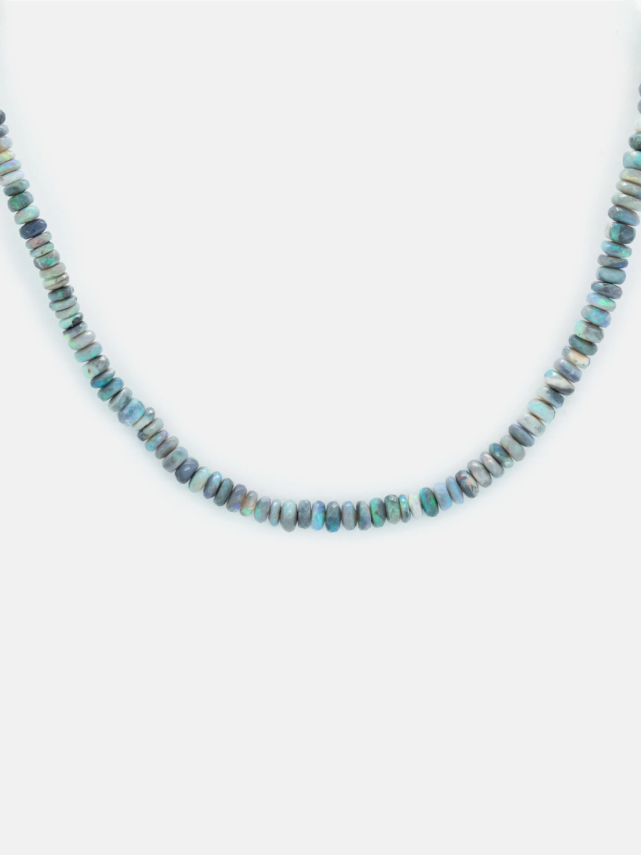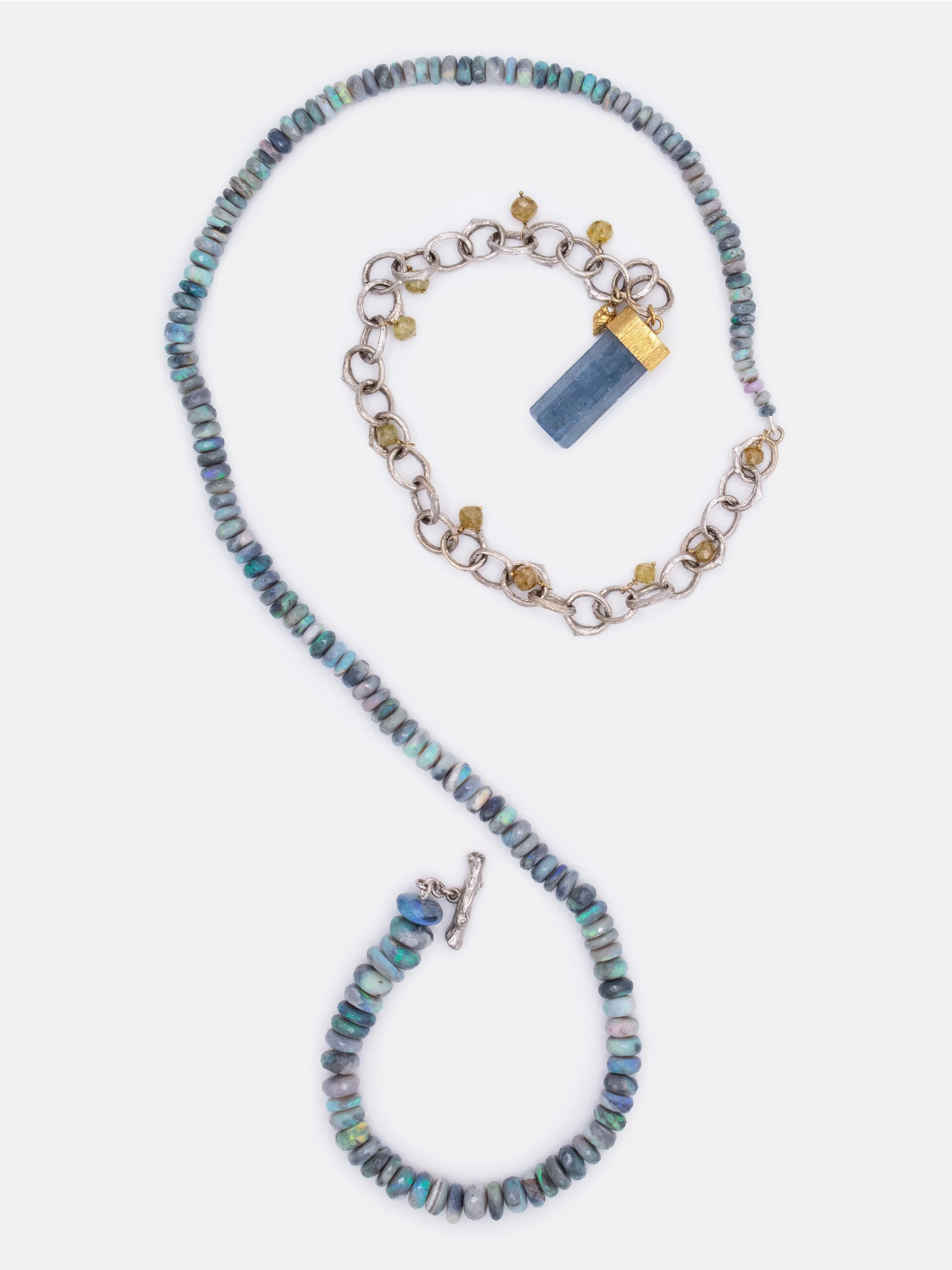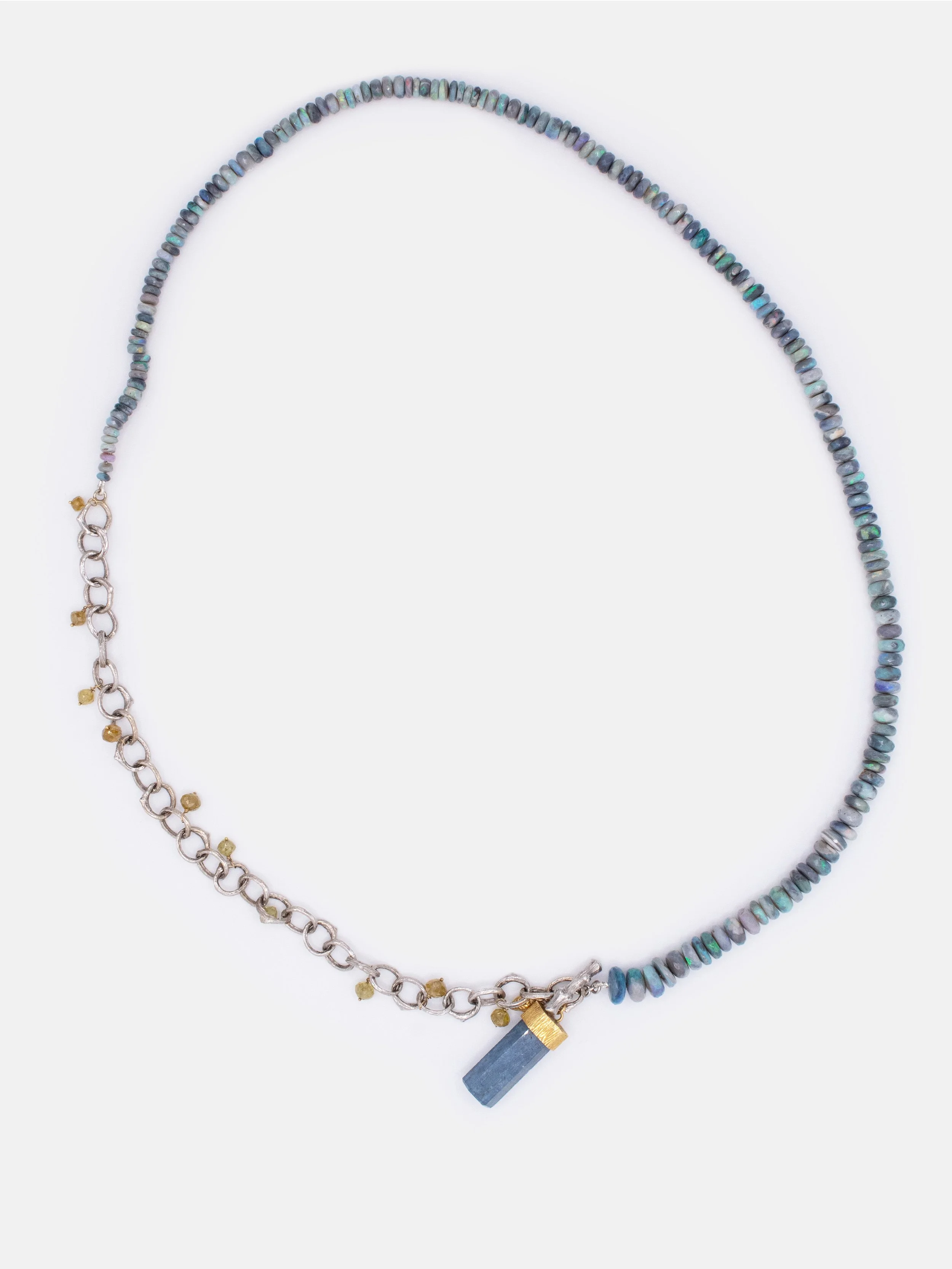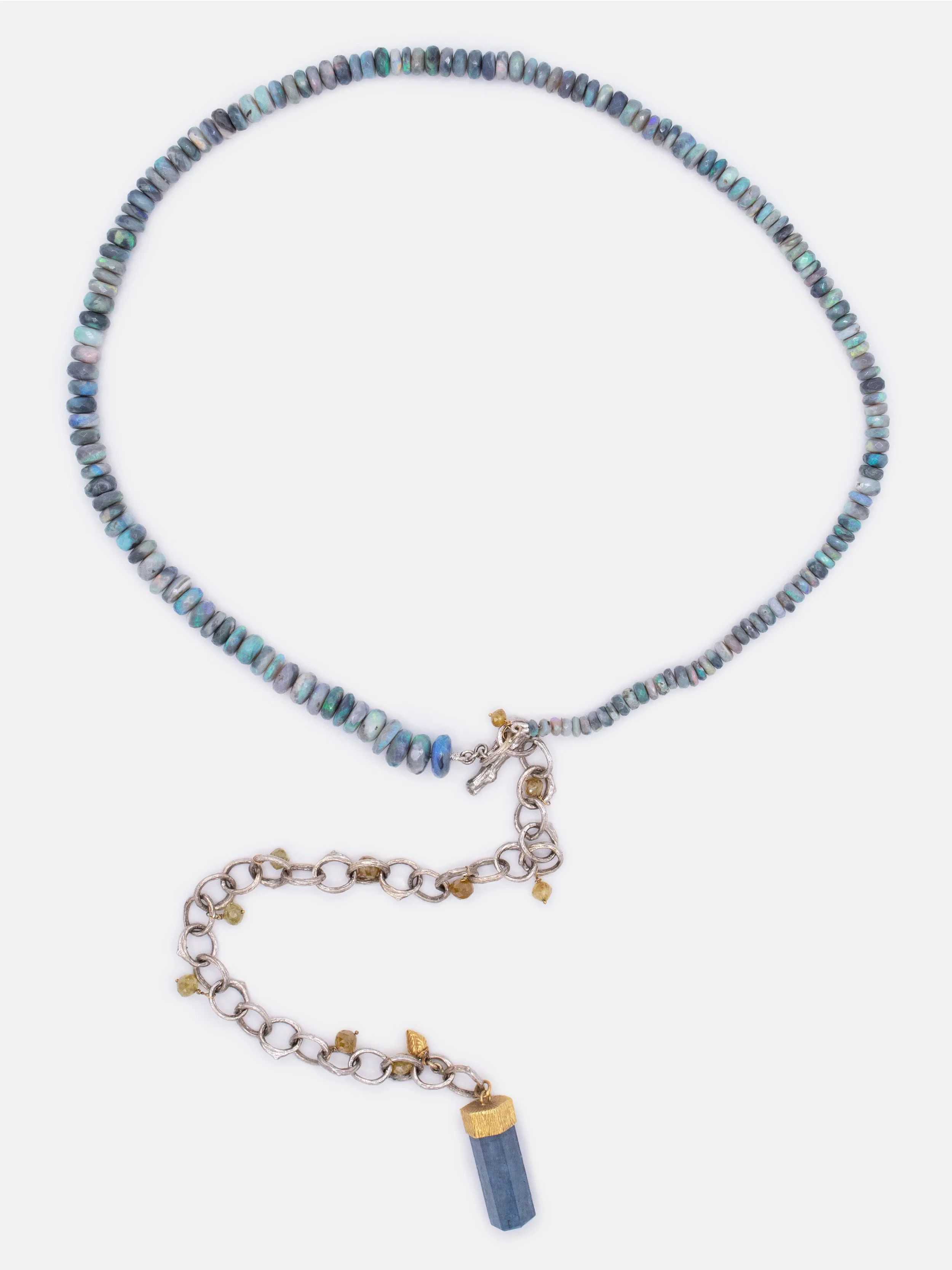 A lariat necklace attributed to Katey Brunini, featuring faceted black opal matrix beads strung on blue silk. The beads are asymmetrically graduated, increasing in size towards one end, creating a fluid and organic drape. From the strand hangs a series of sculptural white gold links suspending faceted yellow diamond beads, finishing with an uncut aquamarine crystal.
