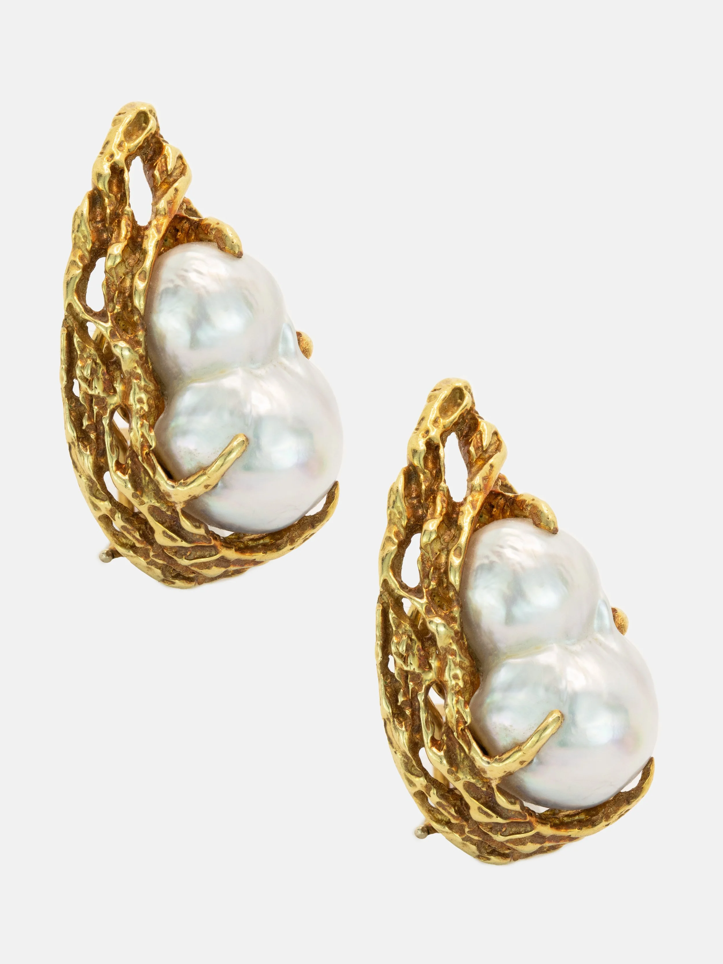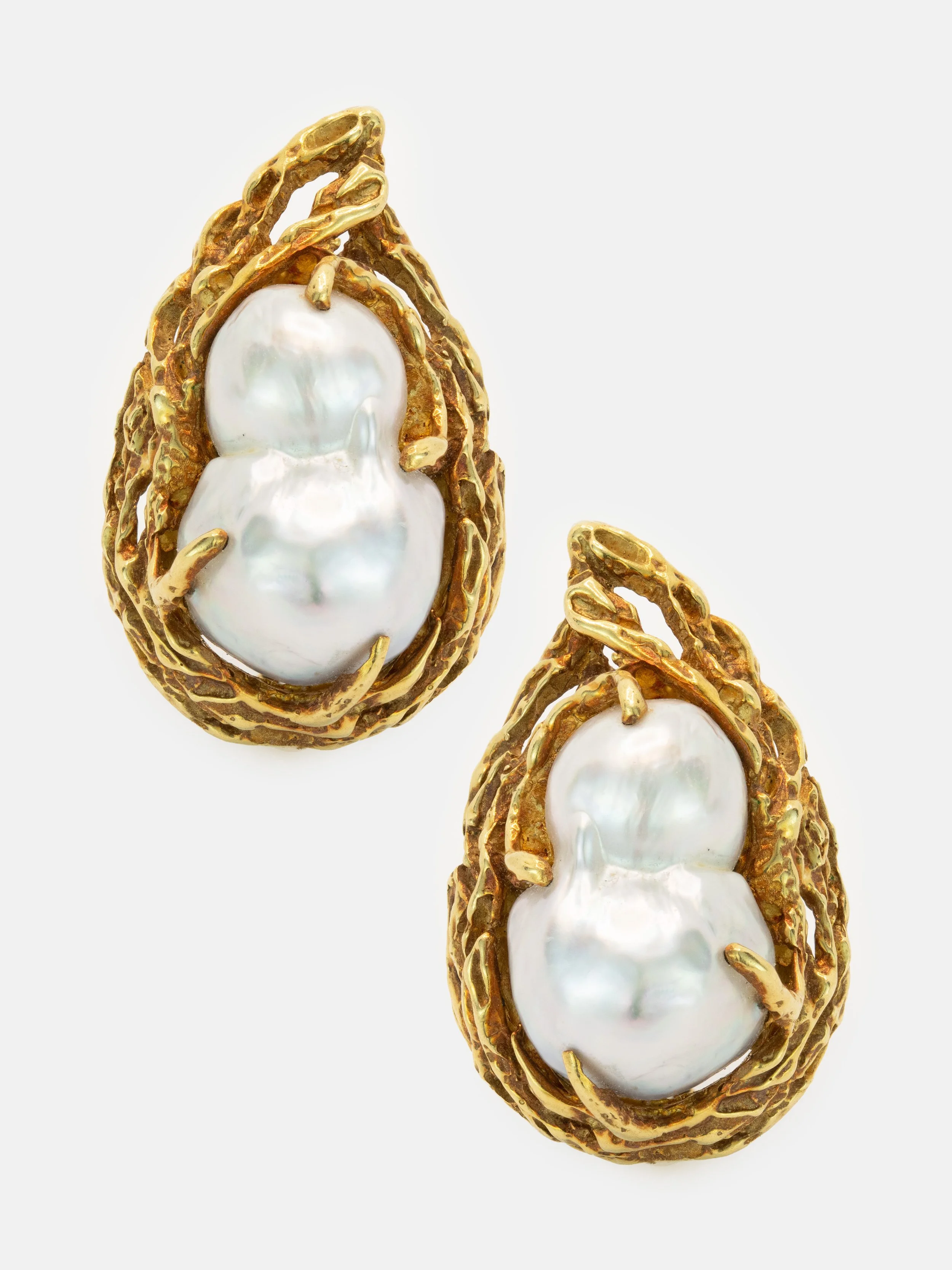 A pair of baroque cultured pearl earrings by Arthur King. Each earring is set with a baroque, South Sea pearl set in the middle of an organic gold ‘nest’. The earrings have a pear or teardrop shape to them.
